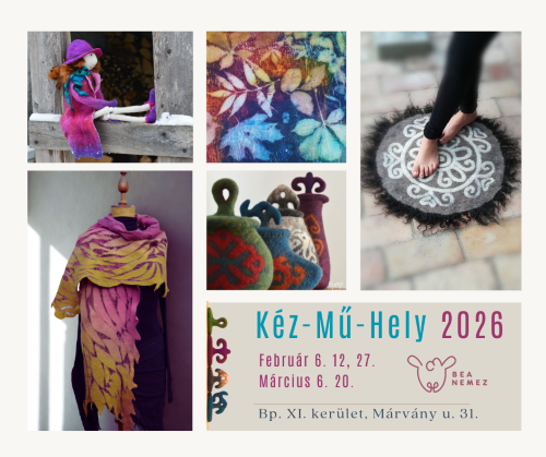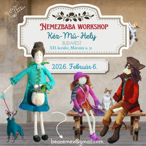 „Egy garantáltan vidám, játékos alkalomra várlak, ahol egy öltöztethető nemezbaba / figura elkészítése során több nemezelő technikát is kipróbálhatsz: A hízlalásos módszert a test elkészítéséhez, mozgatható végtagokkal, arc, haj kialakítását, hímzéssel, varrással, és sablonra nemezelve a ruha, cipő, kalap elkészítését. Lépésről lépésre haladunk, türelemmel segítek a kevésbé gyakorlottaknak is. 🙂