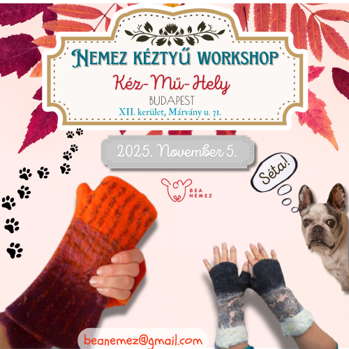 Hajnali kutyasétáltatáshoz, bringázáshoz, nagy őszi sétákhoz készíthesz velem egy pár csinos kéztyűt a Kéz-Mű-Hely-ben!!!A nemezelés során fonalakat, selymet, különféle rostokat is belenemezelhetsz a művedbe, de akár ki is hímezheted!Kezdők, haladók, újrakezdők és profik is jöhetnek.